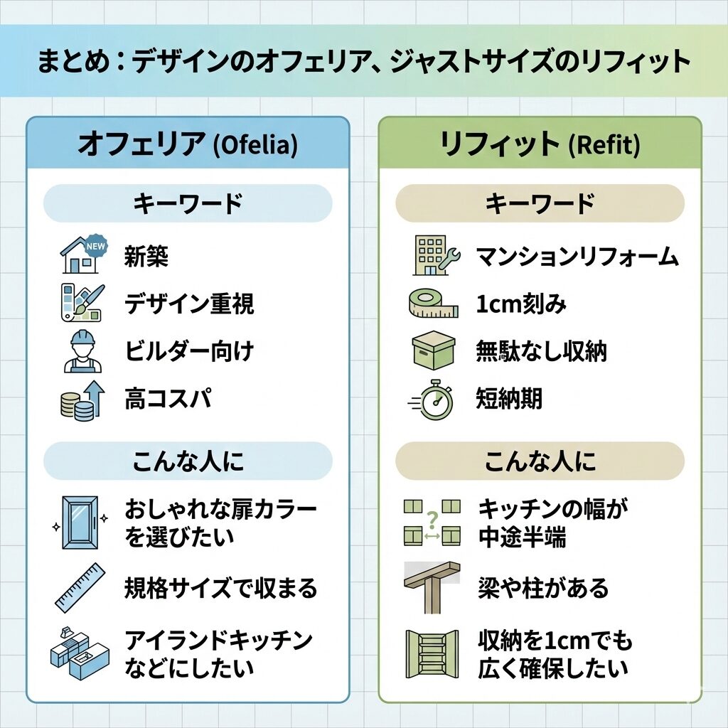結論:オフェリアとリフィットの最大の違いは「サイズ調整力」と「販売ルート」