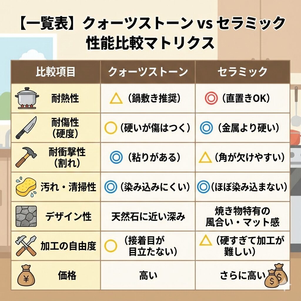 【一覧表】クォーツストーン vs セラミック 性能比較マトリクス