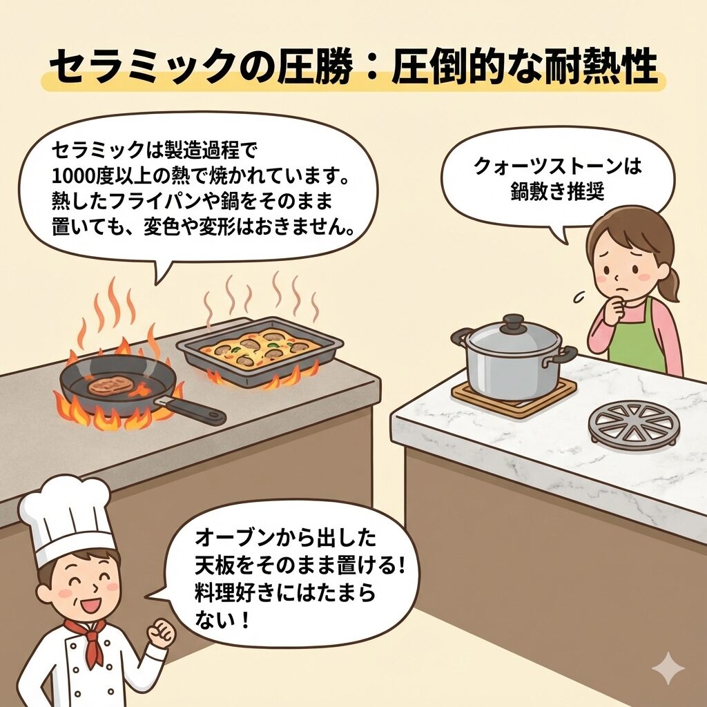 クォーツストーンは93%が石ですが、つなぎに使われている7%の「樹脂」が熱に弱いです。 数百度の鍋を長時間置くと、樹脂が溶けて変色したり、輪ジミができたりするリスクがあります。基本的には「鍋敷き必須」と考えてください。