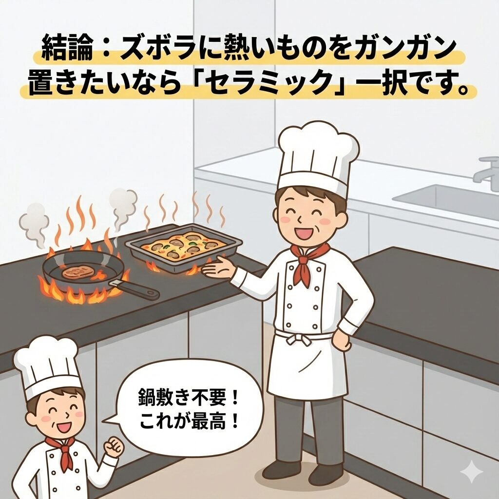 結論: ズボラに熱いものをガンガン置きたいなら「セラミック」一択です。