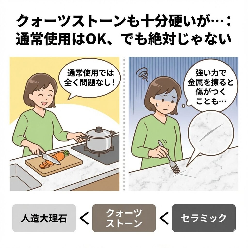 クォーツストーンも人造大理石に比べれば遥かに硬いですが、セラミックほどの無敵感はありません。強い力で金属を擦り付ければ傷がつきます。 通常使用では全く問題ありませんが、「絶対に傷がつかない」わけではありません。