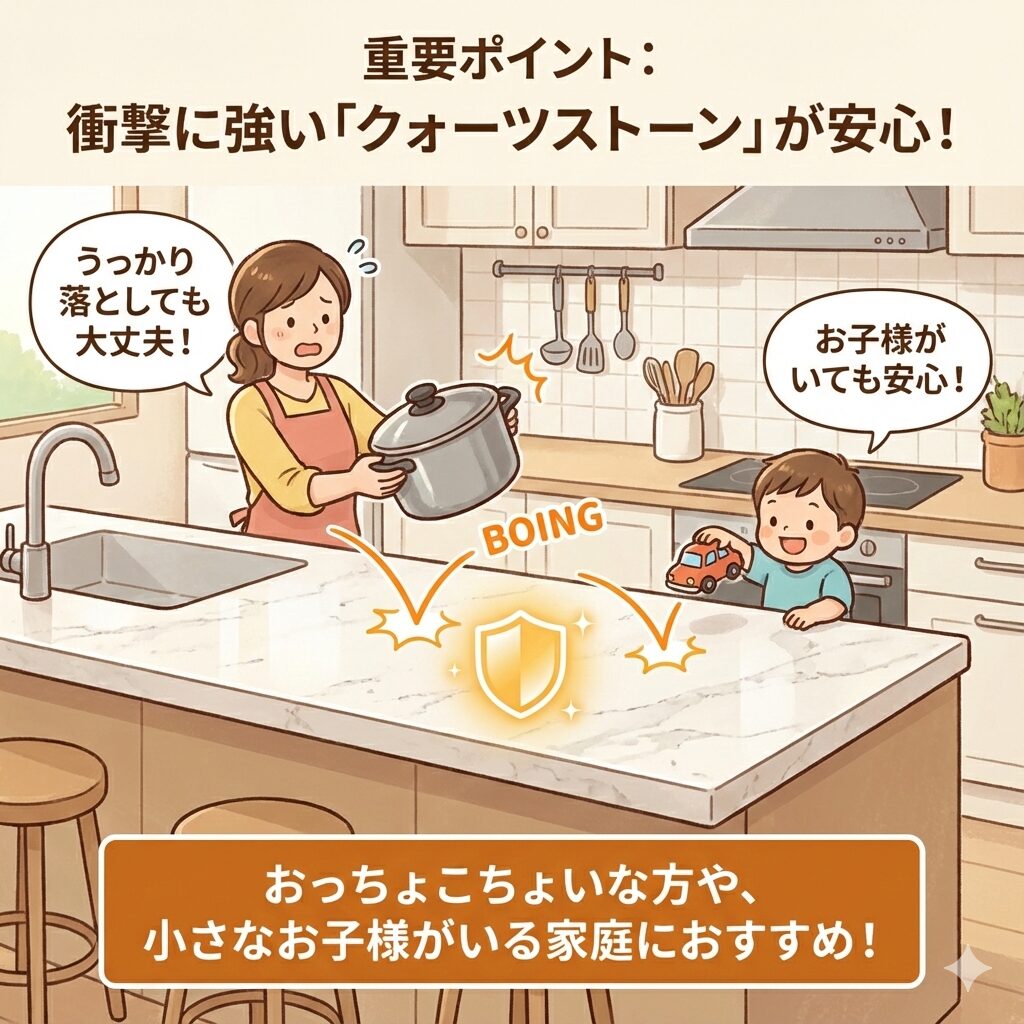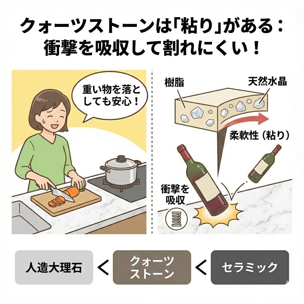 樹脂が含まれているクォーツストーンには、わずかながら「柔軟性(粘り)」があります。そのため、重い缶詰やワインボトルを落としても、衝撃を吸収し、割れにくいです。