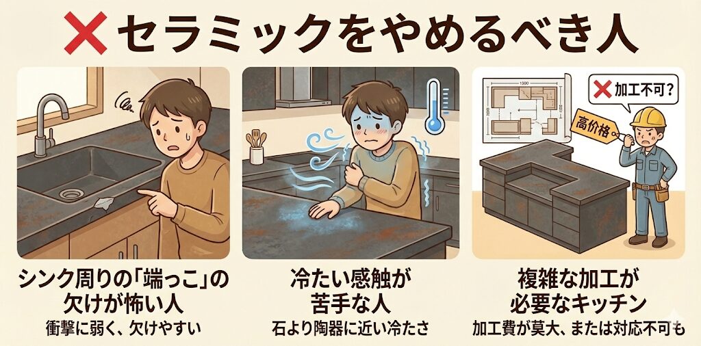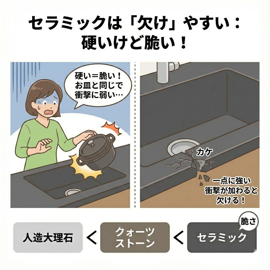 セラミックは「硬い」ですが、イコール「脆(もろ)い」素材でもあります。お皿と同じで、一点に強い衝撃が加わると「パリーン」と割れたり、端っこ(小口)が「カケ」たりするリスクが高いです。 特に、シンク周りのエッジ部分に重い鍋をぶつけて欠けさせてしまう事故は少なくありません。