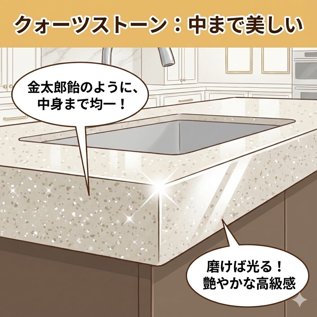 クォーツストーンは金太郎飴のように、中身まで均一に石の粒子が詰まっています。そのため、断面が見える部分や、シンクとの継ぎ目などが非常に滑らかで、「天然石の塊」のような高級感が出ます。磨けば光るため、艶やかな高級感が得意です。