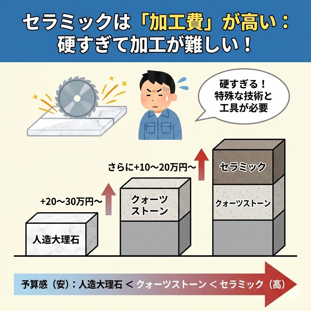 素材自体の価格も高いですが、セラミックは「硬すぎて加工が難しい」ため、加工費・施工費が跳ね上がります。 一般的なシステムキッチンのオプション価格で見ると、人造大理石プラス20〜30万円〜がクォーツストーン、そこからさらに10〜20万円アップがセラミック、といったイメージです(メーカーやグレードによります)。