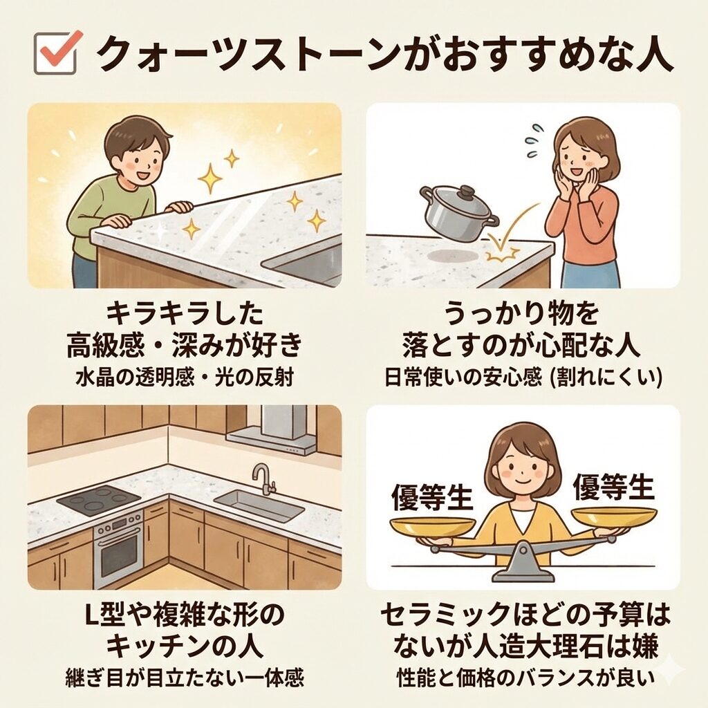 この記事では、クォーツストーンとセラミックの違いを徹底比較し、あなたのライフスタイルにはどちらが適しているのか、明確な答えを提示します。