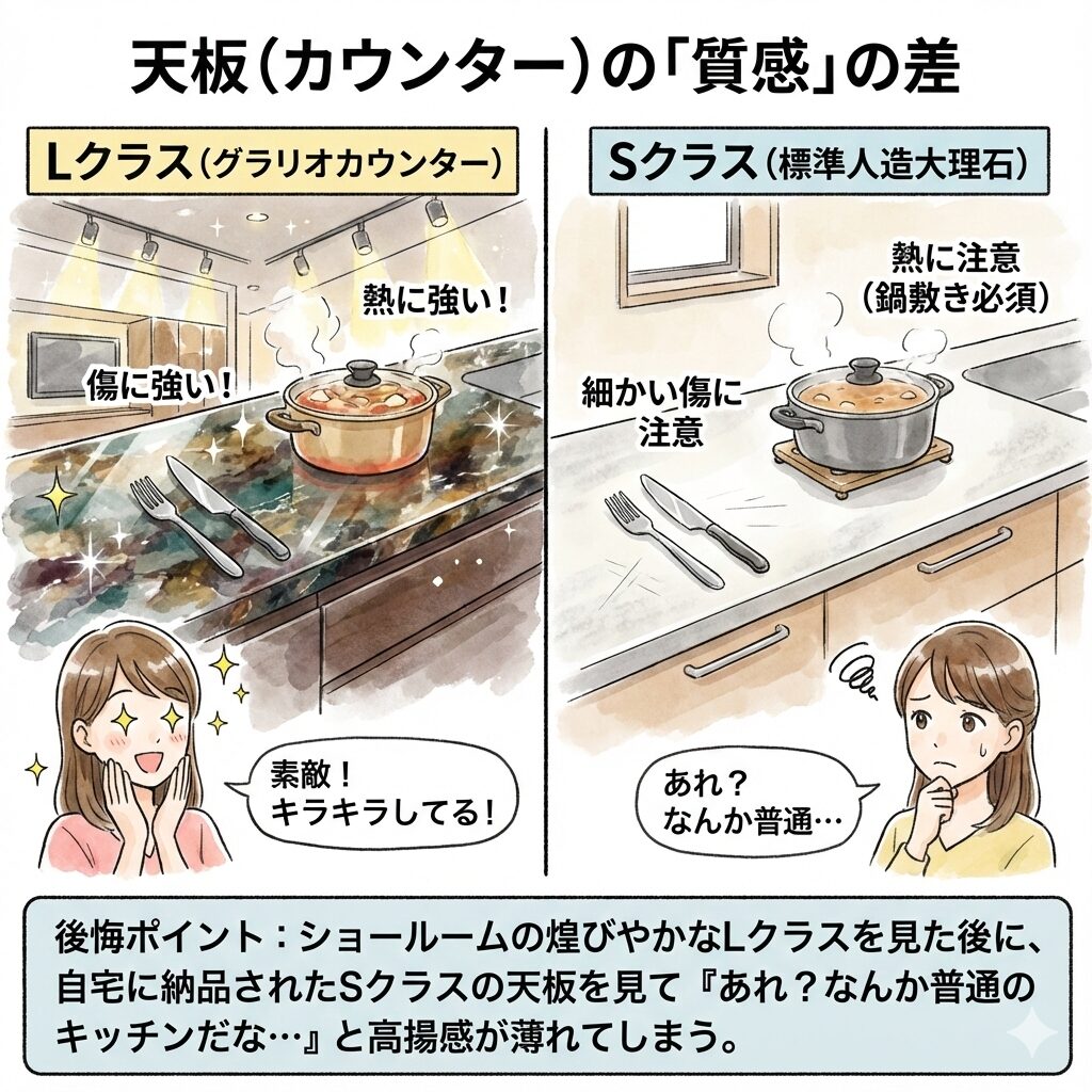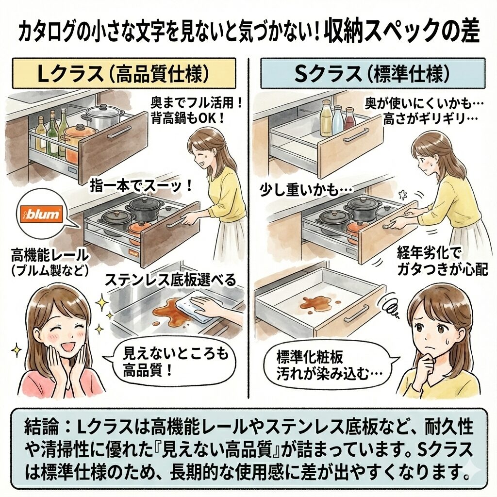 - 底板: Lクラスは引き出しの底板が「ステンレス貼り」を選べ、調味料をこぼしてもサッと拭けますが、Sクラスは標準的な化粧板です。