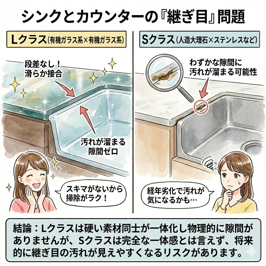 - Sクラス: 人造大理石カウンターに、ステンレスや人造大理石のシンクを接合します。もちろん隙間は少ないですが、Lクラスのような「完全なる一体感」と比較すると、経年劣化で継ぎ目に汚れが見えやすくなる可能性があります。
