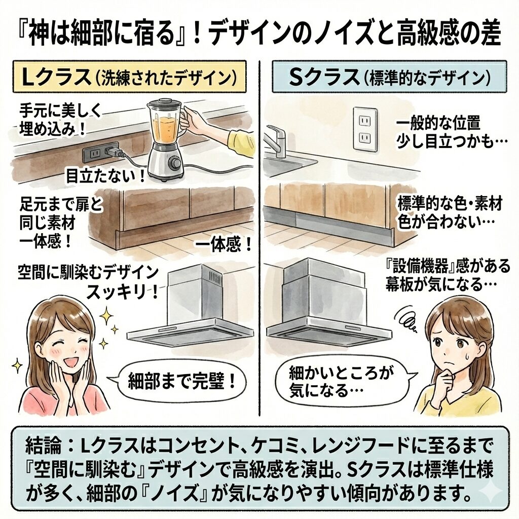 - 幕板やケコミ: 足元の蹴込み部分の色や素材、レンジフードの幕板のデザインなど、Lクラスの方が「空間に馴染む」選択肢が多く、Sクラスは「設備機器」としての主張が強くなる傾向があります。