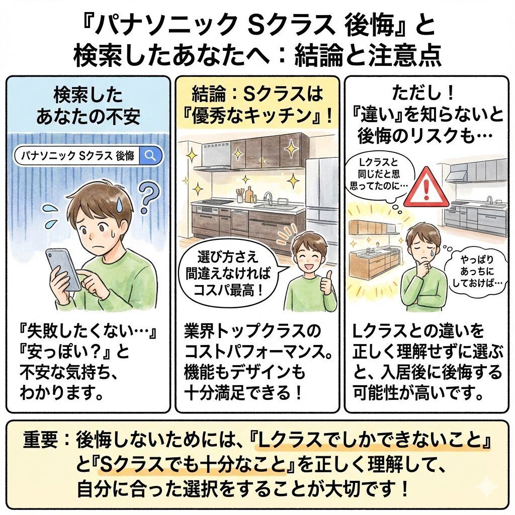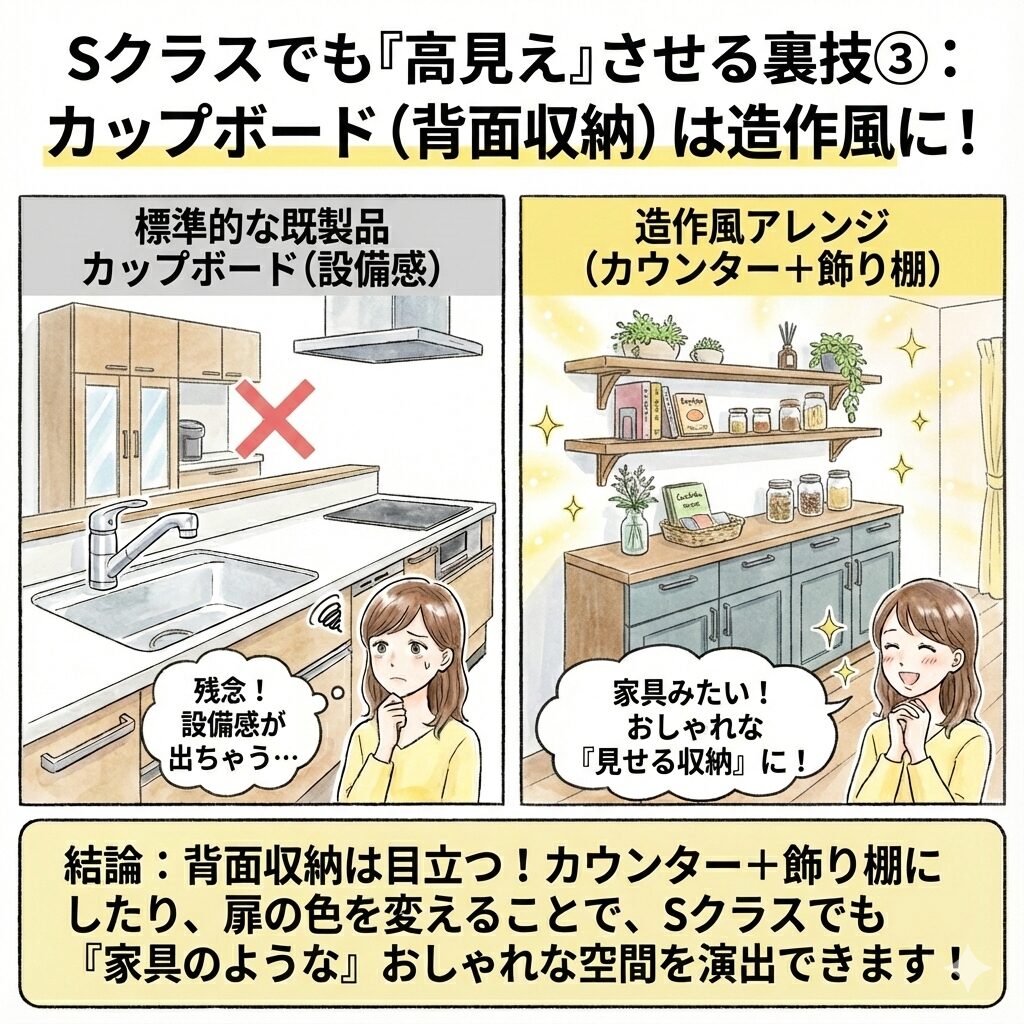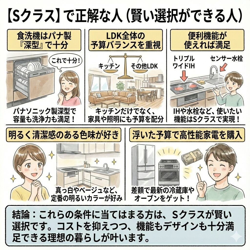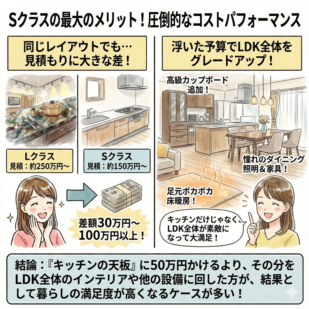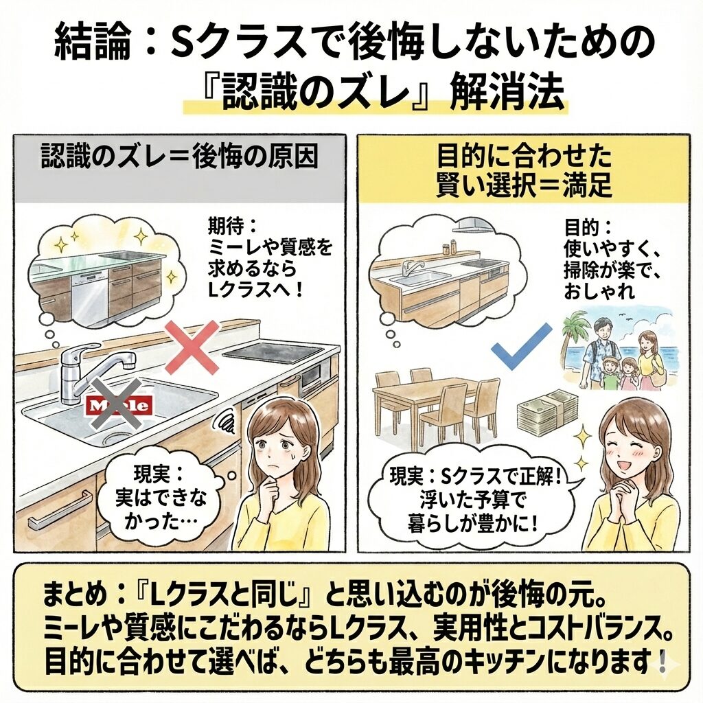 しかし、もしあなたが「使いやすくて、掃除が楽で、おしゃれなキッチン」を求めているなら、Sクラスは間違いなく正解の選択肢です。浮いた数十万円で、家族で旅行に行ったり、素敵なダイニングチェアを買ったりする方が、暮らしの満足度は上がるかもしれません。