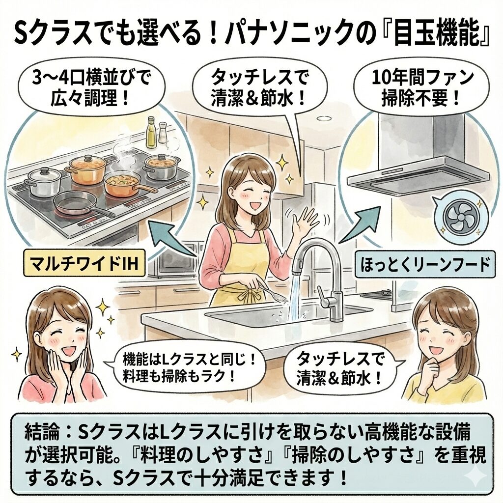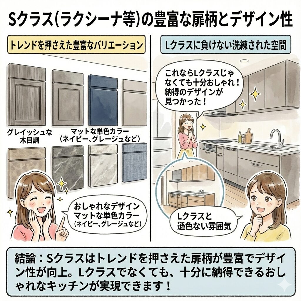 これらの人気機能は、Sクラス(ラクシーナ)でも問題なく選択可能です。 「料理のしやすさ」や「掃除のしやすさ」という機能面だけで言えば、SクラスはLクラスに全く引けを取りません。