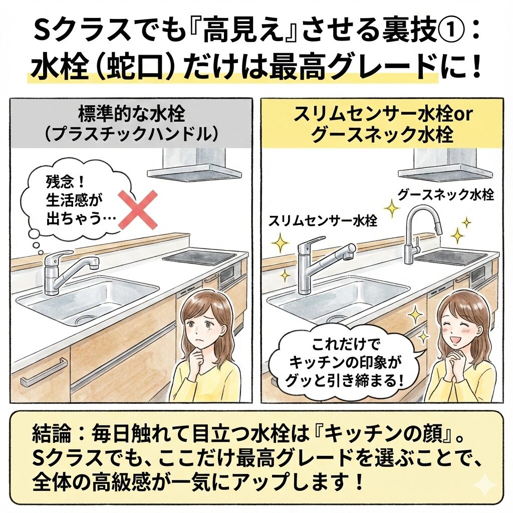キッチンの中で最も目立ち、毎日触れるのが水栓です。ここに標準的なプラスチックハンドルの水栓を選ぶと、一気に生活感が出ます。 Sクラスであっても「スリムセンサー水栓」や、デザイン性の高い「グースネック水栓」を選んでください。これだけでキッチンの印象がグッと引き締まります。