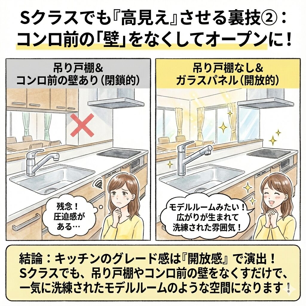 キッチンのグレード感は「開放感」で演出できます。 吊り戸棚をなくし、コンロ前もガラスパネル(あるいは壁なし)にしてフルフラット対面にするだけで、Sクラスの天板でも広がりが生まれ、モデルルームのような洗練された雰囲気になります。