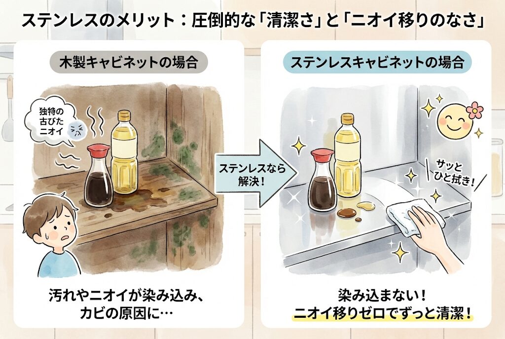 ステンレスは金属素材なので、醤油や油が染み込むことがありません。木製キャビネットの場合、長年使うと調味料の液だれなどで内部にカビが生えたり、独特の古びたニオイが染み付くことがありますが、ステンレスキャビネットならその心配がゼロです。