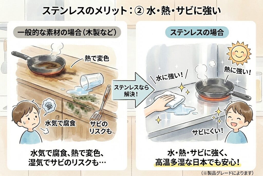 ステンレスは水に強く、高温のフライパンを置いても変色しにくい耐熱性を持っています(※製品グレードによります)。日本の高温多湿な気候において、腐食しないステンレスは最強の素材と言えます。