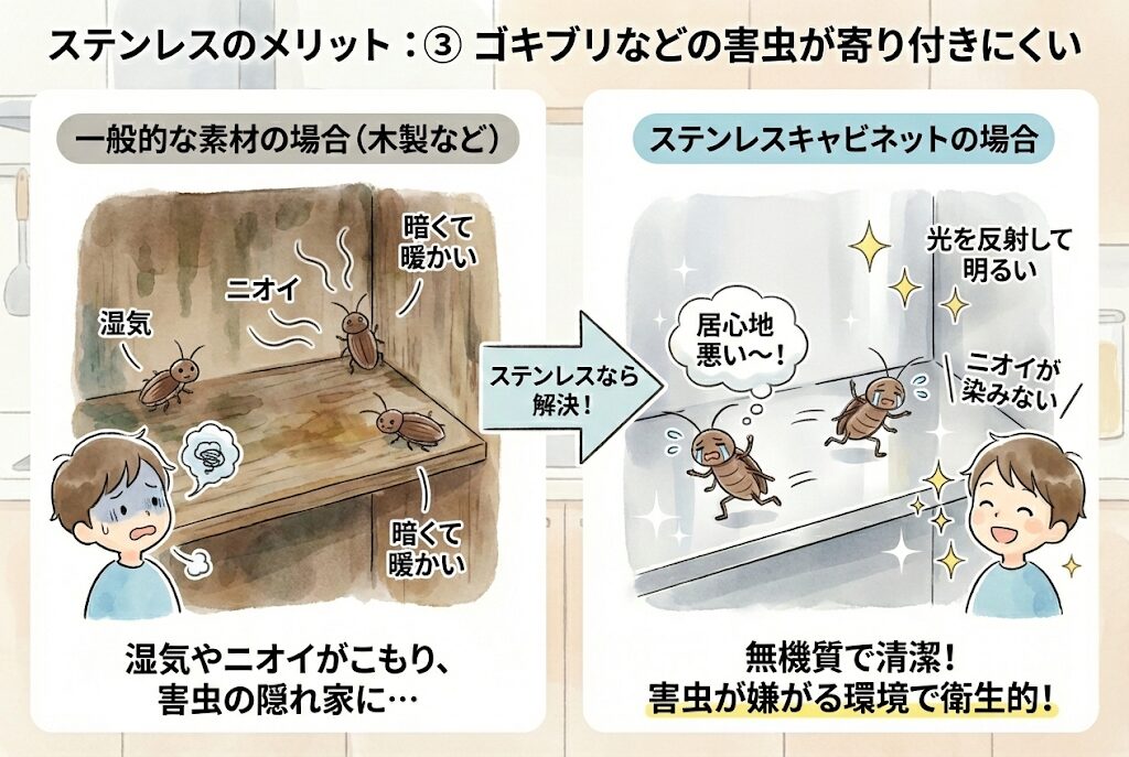 これは意外と知られていない大きなメリットです。害虫は湿気や食品のニオイ、そして身を隠せる暗くて暖かい場所を好みます。ステンレスキャビネットはニオイが染み込まず、光を反射し、無機質であるため、害虫にとって「居心地の悪い場所」となります。衛生面を重視する方には最強のメリットです。