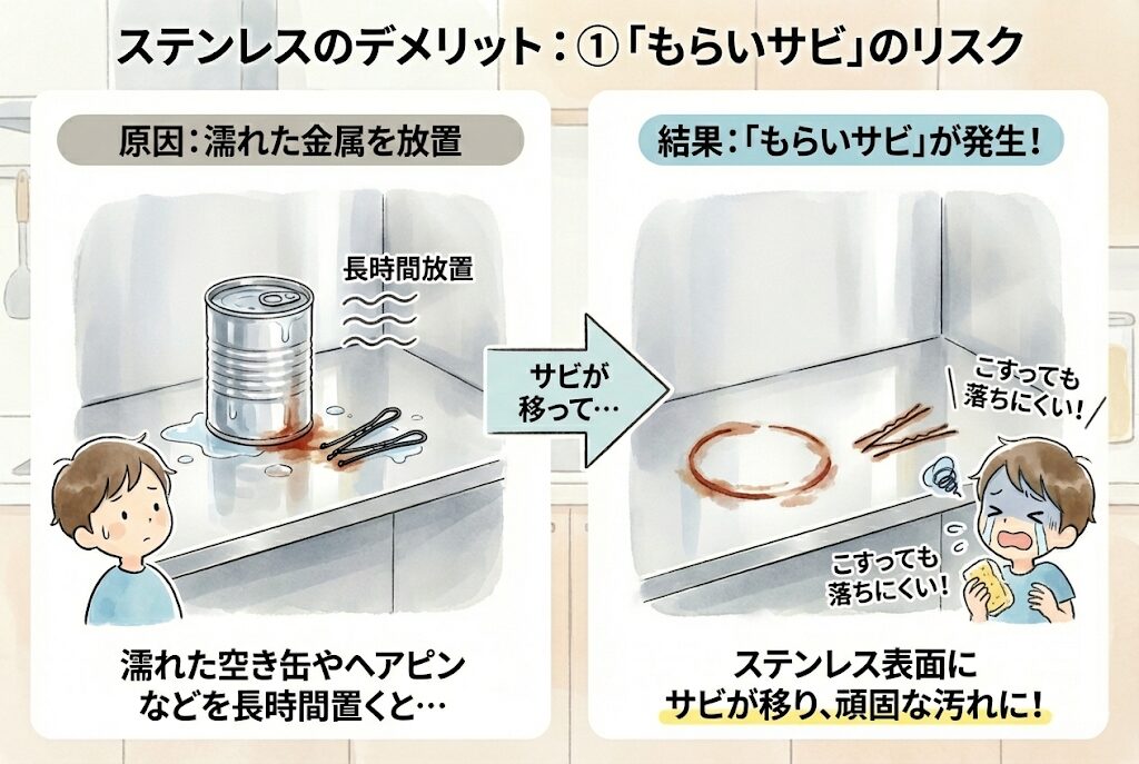 ステンレス自体はサビにくいですが、濡れた空き缶やヘアピンなどを長時間放置すると、そこからサビが移る「もらいサビ」が発生します。