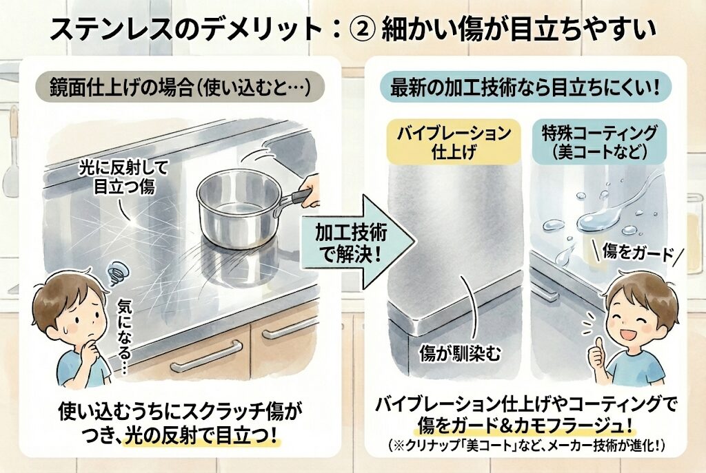 鏡面仕上げの場合、使い込むうちに細かいスクラッチ傷がつきます。 (※ただし、最近はクリナップの「美コート」やバイブレーション仕上げなど、傷を目立たせない加工技術が進化しています)