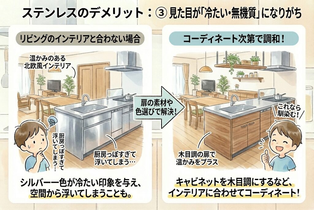 シルバー一色の世界は、リビングと一体化した対面キッチンの場合、インテリアによっては「厨房っぽすぎて浮いてしまう」ことがあります。
