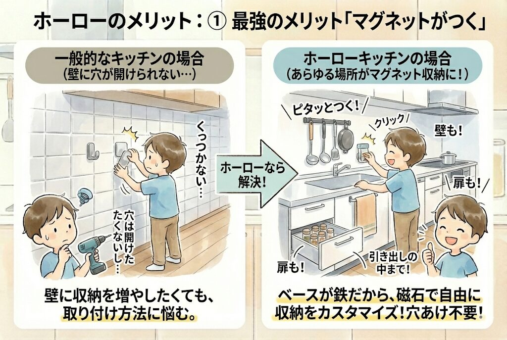 - 「掃除の時間を半分にしたい」「壁面収納でキッチンを広く使いたい」ならホーローが最強です。