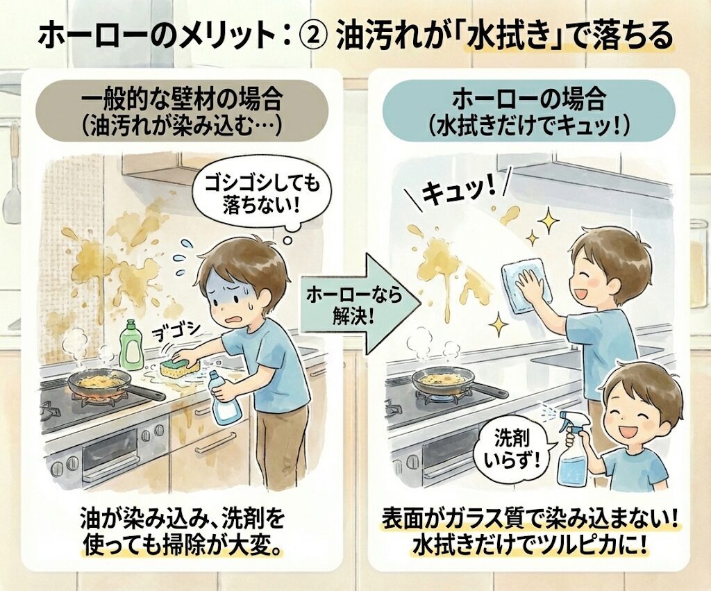 表面がガラス質でツルツルしているため、油汚れが染み込みません。揚げ物をした後の壁のベタつきも、サッと水拭きするだけで「キュッ」と落ちます。洗剤を使わなくても綺麗になる掃除の楽さは、ホーローならではです。