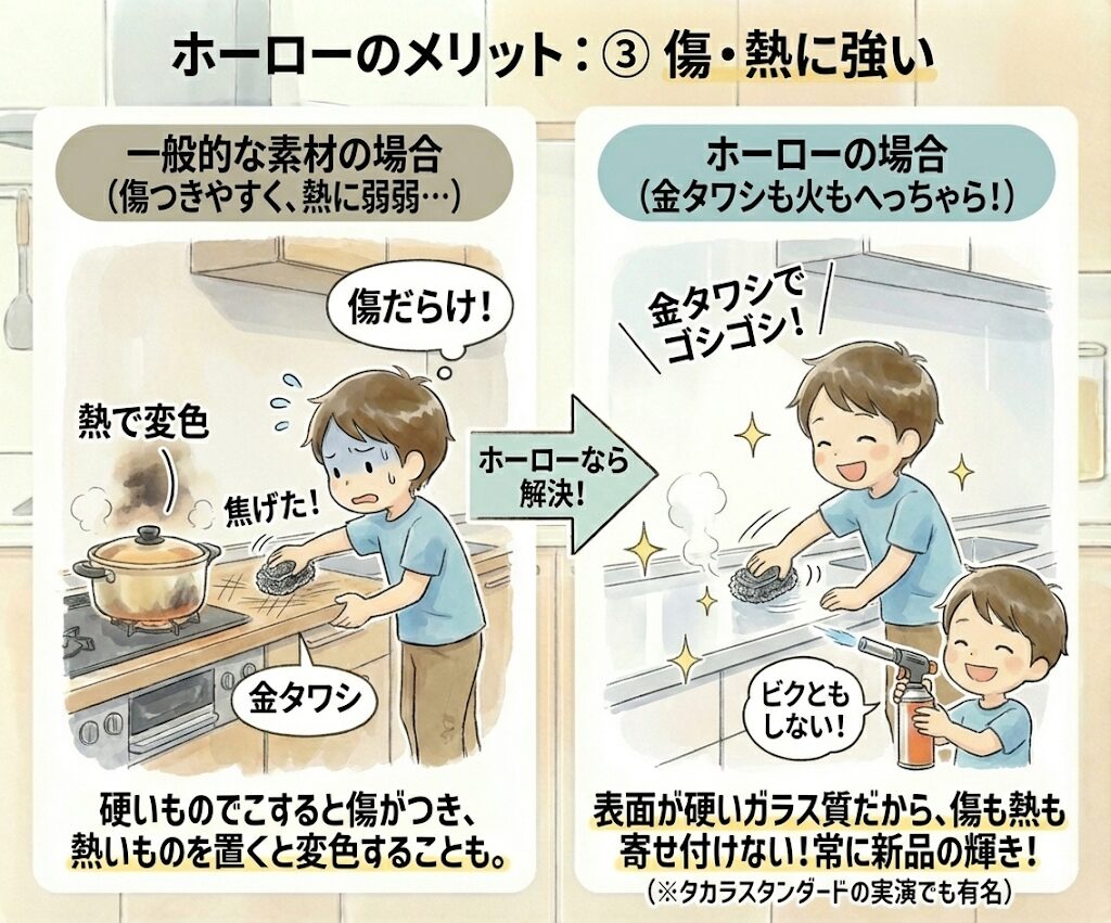 タカラスタンダードの実演で有名ですが、金タワシでこすっても、火で炙ってもビクともしません。硬いブラシでゴシゴシ洗えるので、常に新品のような輝きを保てます。