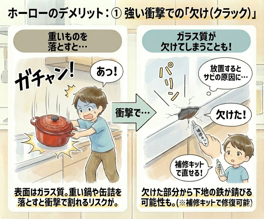 表面はガラス質です。重い鋳物ホーロー鍋(ル・クルーゼなど)や缶詰を高いところから角に落とすと、ガラス層が「パリン」と欠けてしまうことがあります。欠けた部分から下地の鉄が錆びる可能性があります(※補修キットで直せます)。