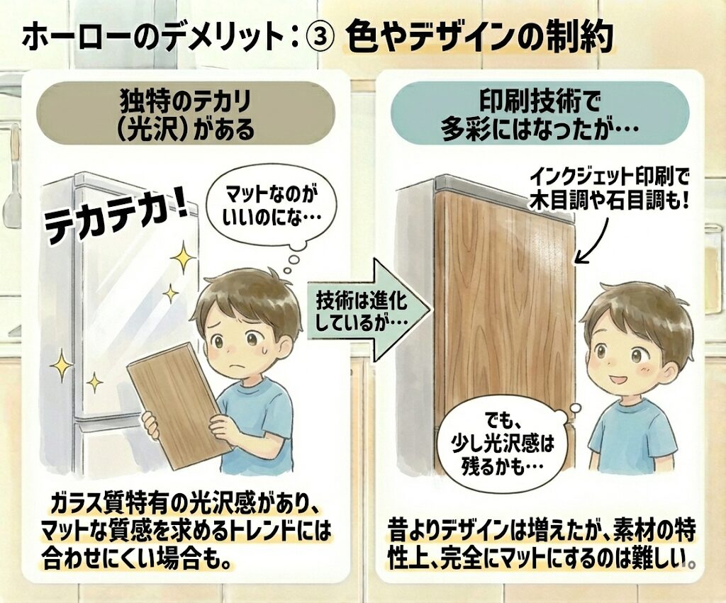 昔に比べればインクジェット印刷技術で木目調や石目調など多彩になりましたが、ステンレスや人工大理石、木製キッチンに比べると、独特のテカリ(光沢)があります。「マットな質感が好き」というトレンドには少し合わせにくい場合があります。