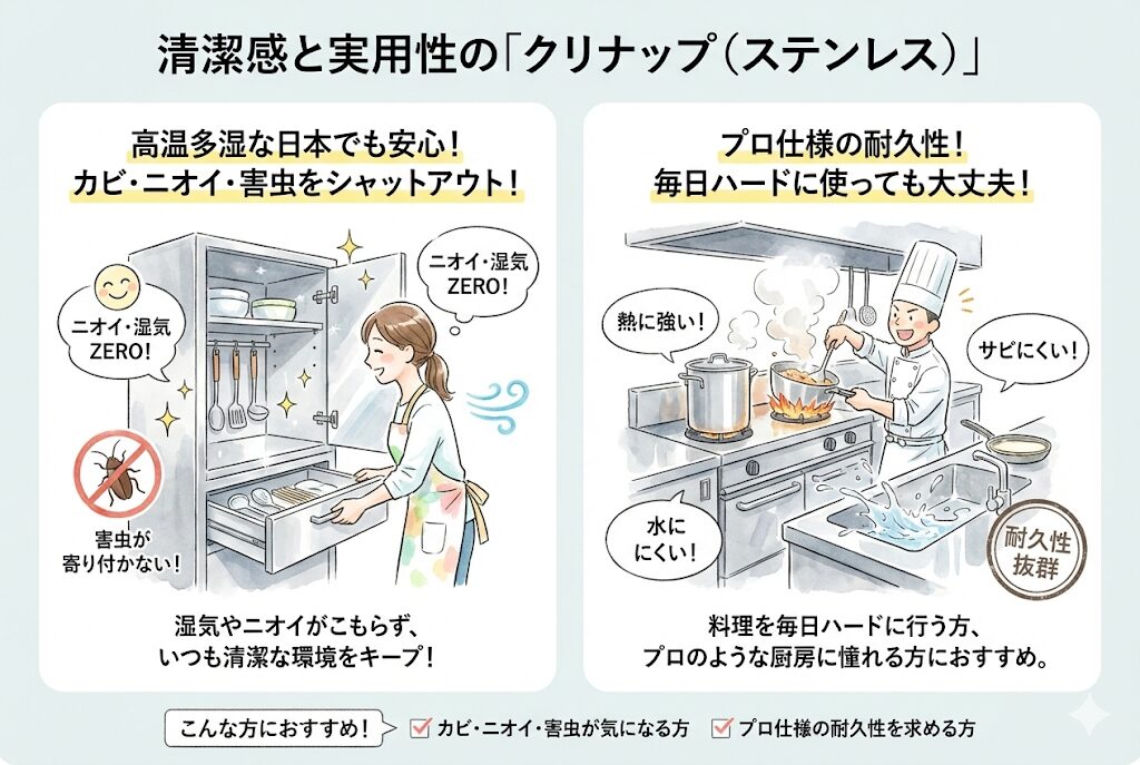 - 高温多湿な日本で、カビ・ニオイ・害虫のリスクを極限まで減らしたいならステンレス一択です。