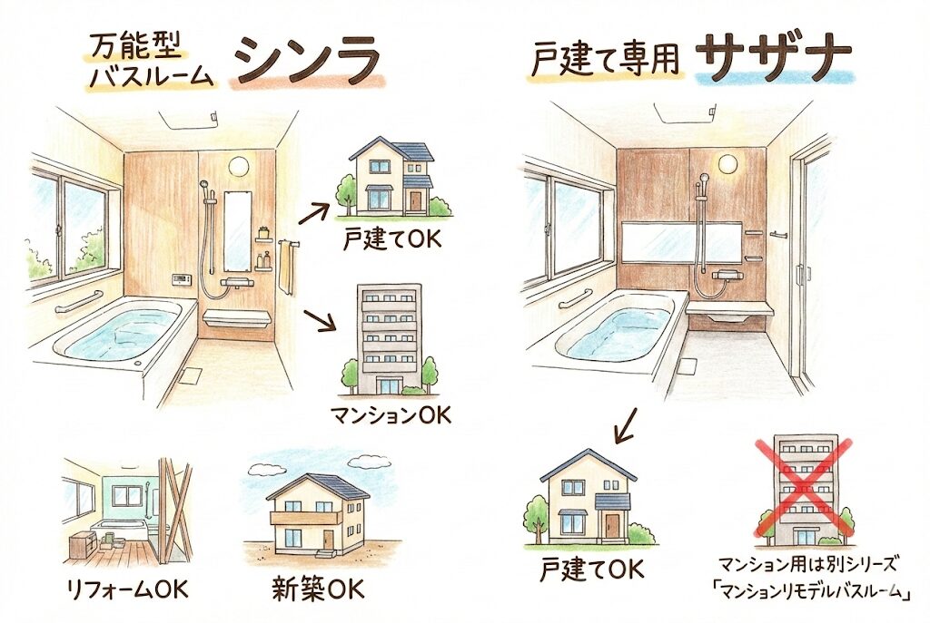 サザナは戸建て専用です。マンション用には「マンションリモデルバスルーム」という別のシリーズが用意されています。