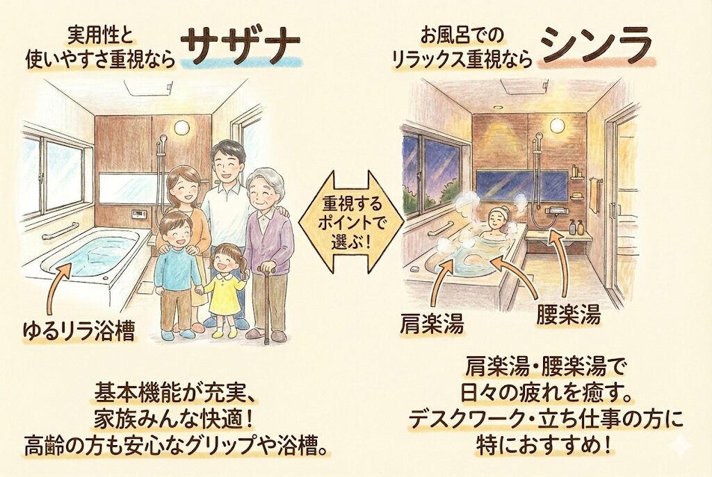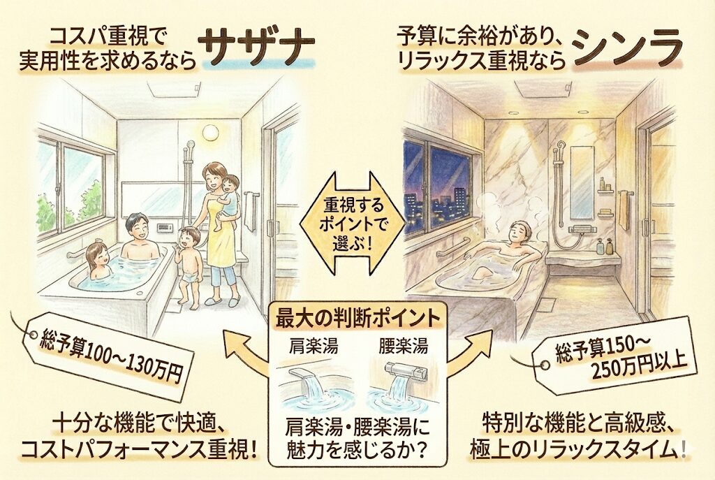 予算に余裕があり、お風呂でのリラックスを重視するならシンラ、コスパ重視で実用性を求めるならサザナがおすすめです。肩楽湯・腰楽湯に魅力を感じるかが、最大の判断ポイントになります。