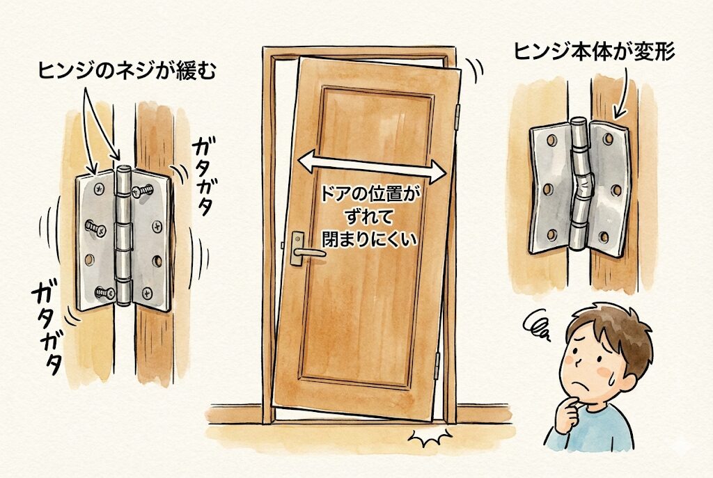 ドアと壁をつなぐヒンジのネジが緩むと、ドアの位置がずれて閉まりにくくなります。長年の使用による振動で、ネジが徐々に緩んでいくのが一般的です。また、ヒンジ本体が変形している場合もあります。