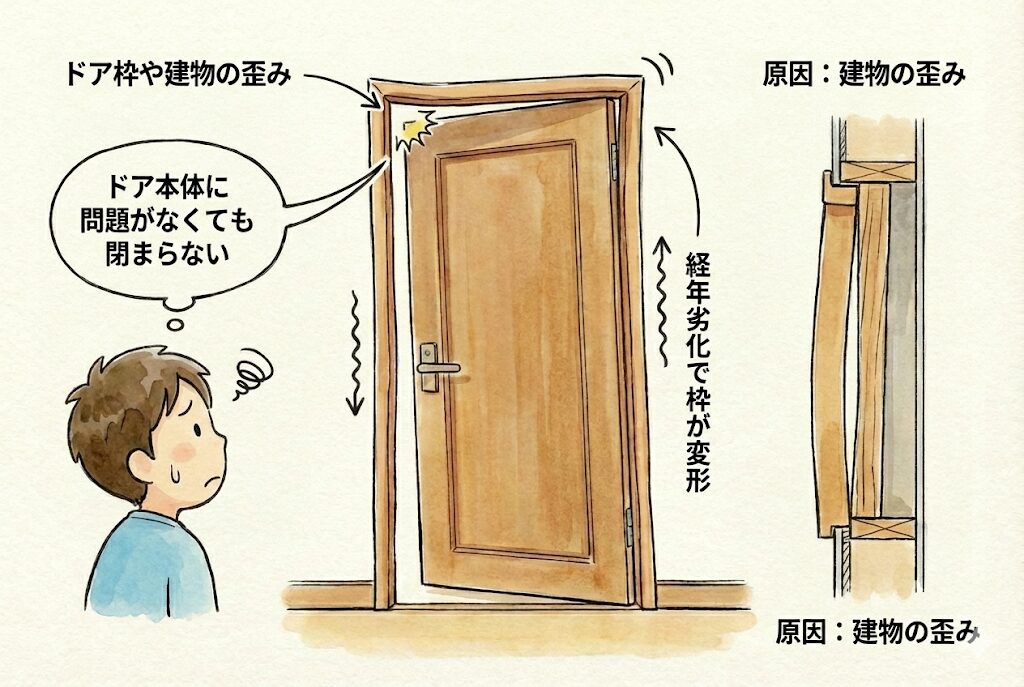 経年により建物自体が歪んだり、ドア枠が変形したりすることで、ドアが閉まらなくなるケースもあります。この場合、ドア本体に問題がなくても正常に機能しません。