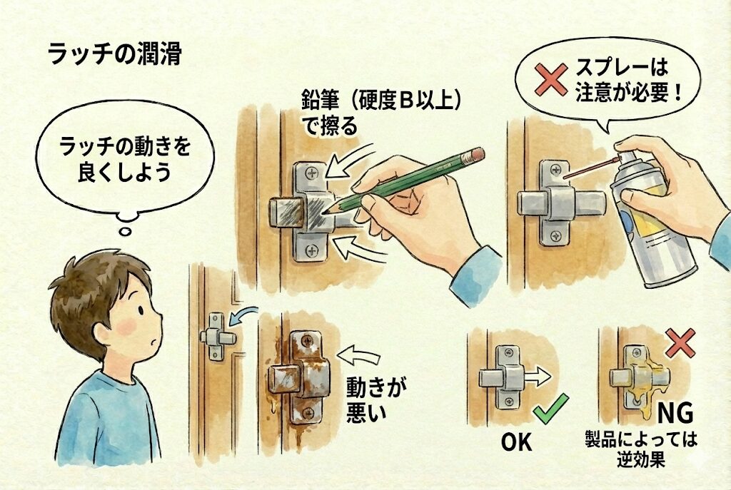 ラッチの動きが悪い場合は、硬度B以上の鉛筆を金属部分に擦りつけることで滑りが改善することがあります。潤滑スプレーを使用する方法もありますが、製品によっては逆効果になることもあるため注意が必要です。