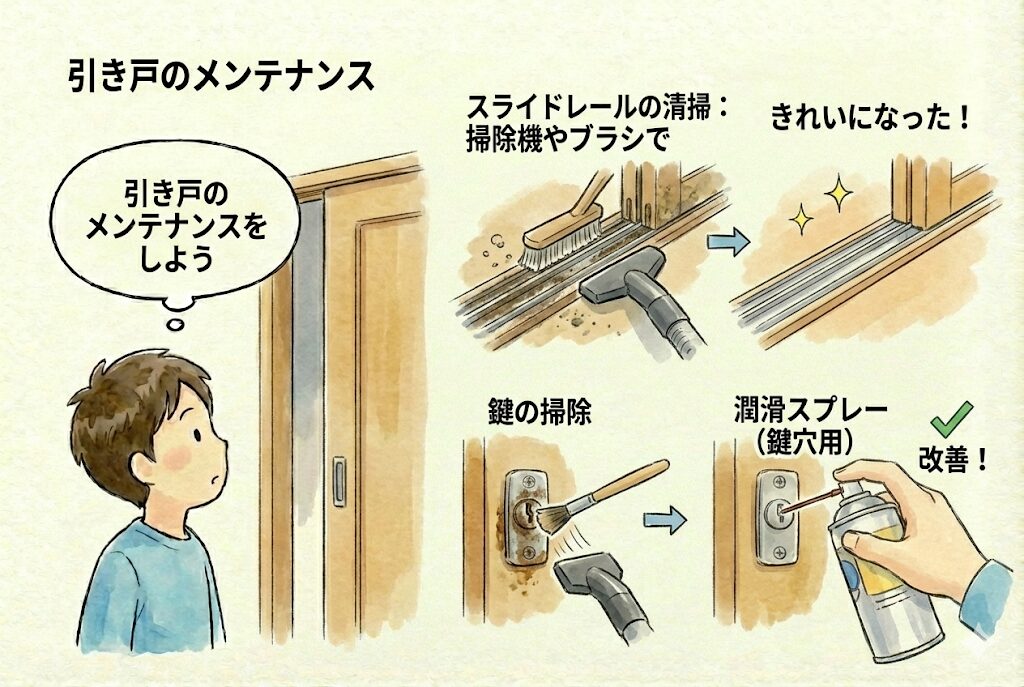 スライドレールに汚れが溜まっている場合は、掃除機やブラシで清掃しましょう。鍵に問題がある場合は、鍵穴や鍵の掃除、潤滑スプレーの使用で改善することがあります。