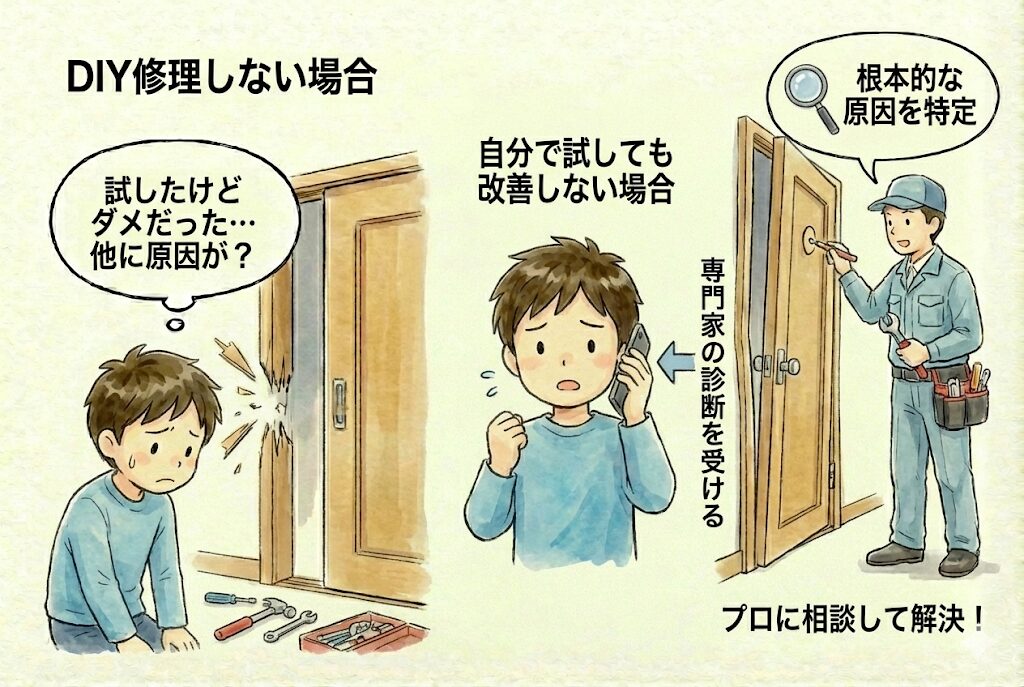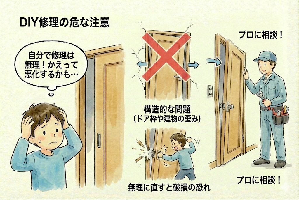 ドア枠や建物の歪みは、自分で修理するのは不可能です。無理に直そうとすると建具がずれたり部品が破損したりして、かえって状態が悪化する恐れがあります。