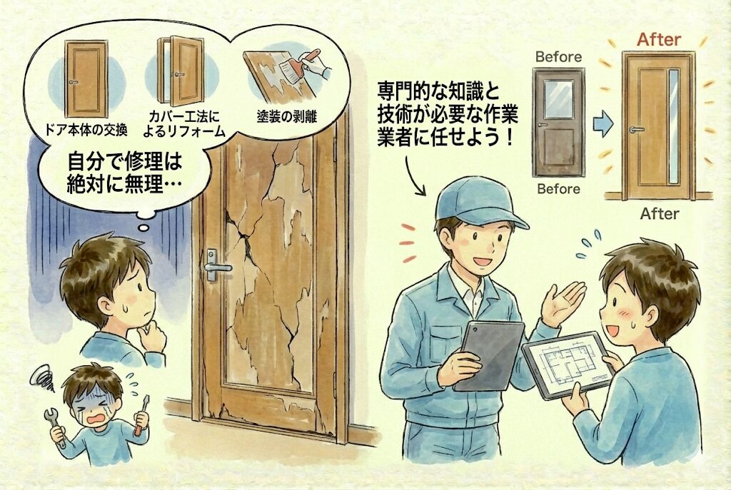ドア本体の交換やカバー工法によるリフォーム、塗装の剥離など、専門的な知識と技術が必要な作業は業者に任せるべきです。