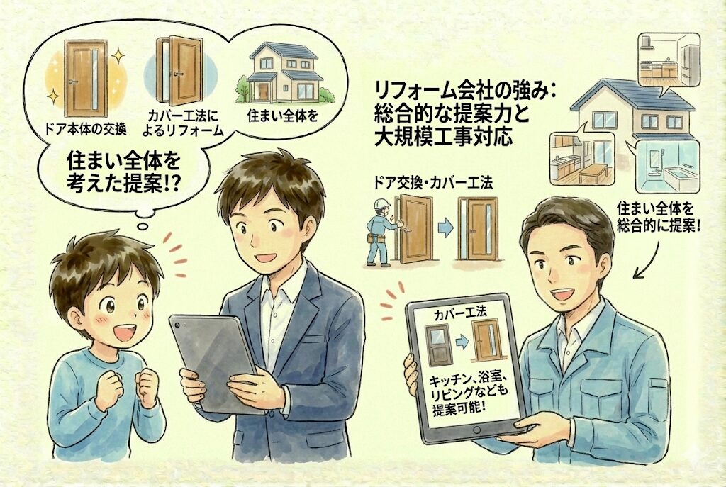 ドアの修理だけでなく、住まい全体を考えた総合的な提案力が強みです。ドア交換やカバー工法など、大規模な工事にも対応できます。
