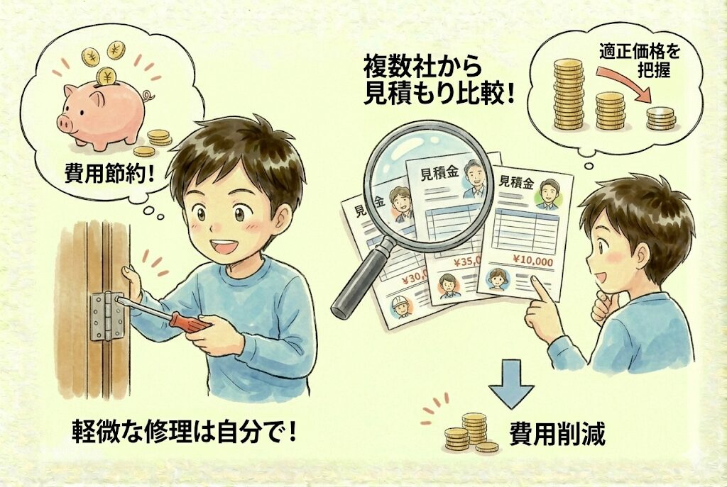 複数の業者から見積もりを取って比較することで、適正価格を把握できます。また、軽微な修理であれば自分で対処することで費用を抑えられます。