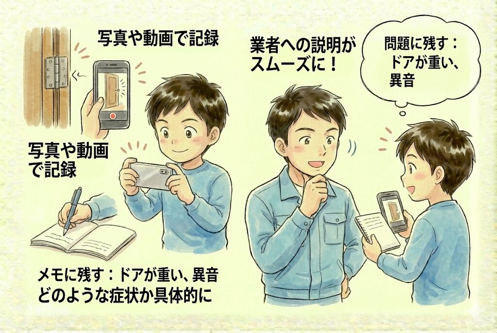 どのような症状が出ているのか、具体的に記録しておきましょう。写真や動画で記録しておくと、業者への説明がスムーズになります。
