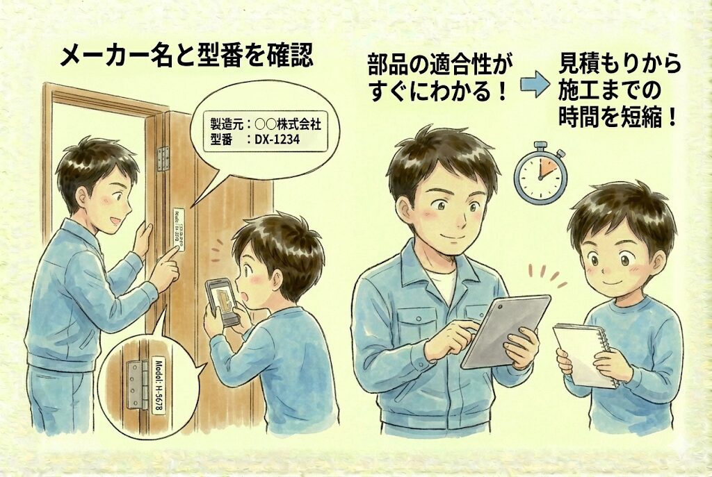 ドアの側面や蝶番部分に貼られたラベルで、メーカー名と型番を確認しましょう。この情報があれば、業者はすぐに部品の適合性を判断でき、見積もりから施工までの時間を短縮できます。
