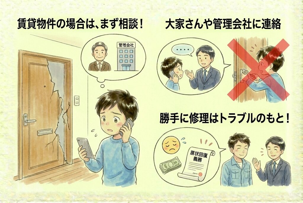 賃貸物件の場合は、大家さんや管理会社に事前に相談する必要があります。原状回復義務があるため、勝手に修理するとトラブルになる可能性があります。