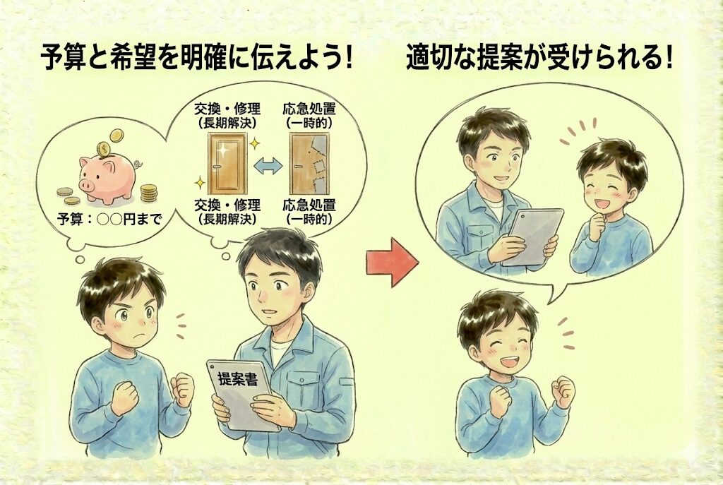 修理にかけられる予算や、どの程度の仕上がりを求めるかを明確にしておきましょう。交換か修理か、応急処置でよいのか長期的な解決を求めるのかなど、希望を伝えることで適切な提案を受けられます。