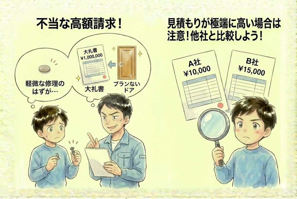 軽微な修理で済むにもかかわらず、ドア一式の交換を提案して法外な料金を請求するケースがあります。見積もりが他の業者と比べて極端に高い場合は注意が必要です。