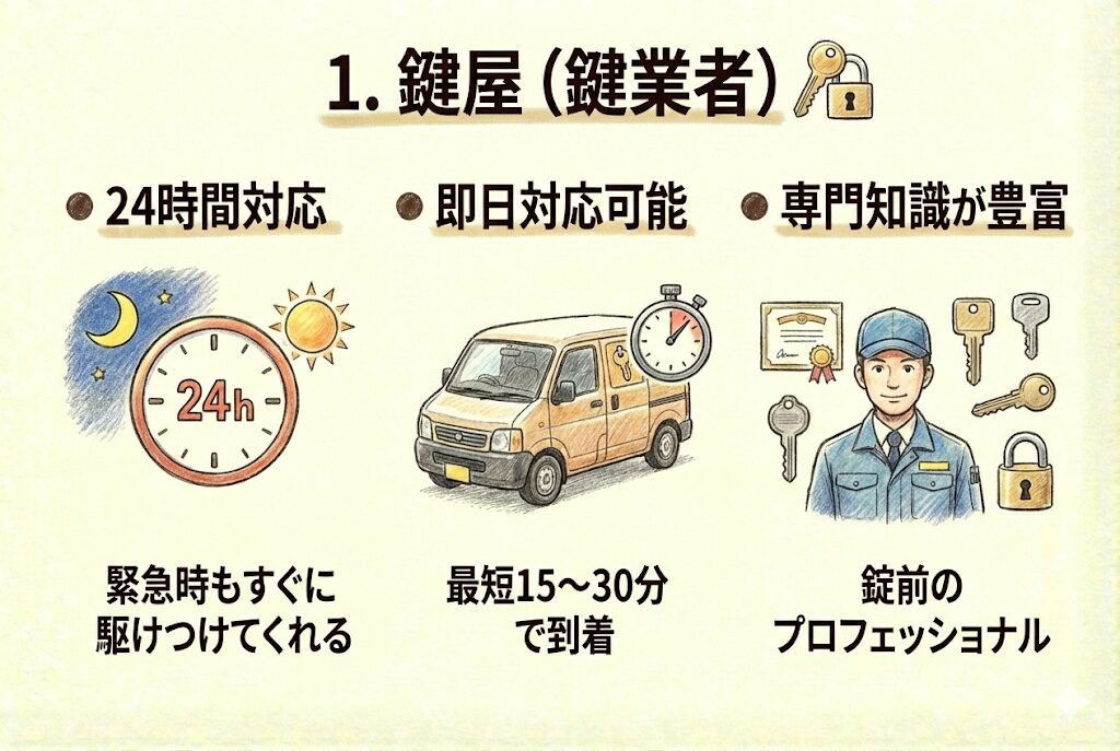 1. 鍵屋:24時間対応、即日交換可能、専門知識豊富