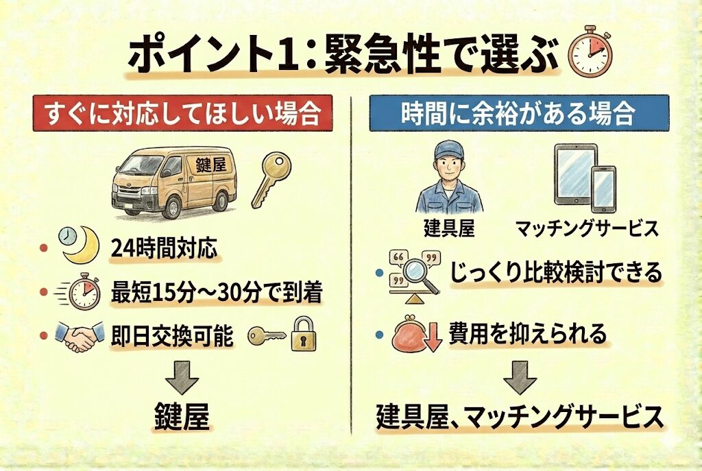 「ドアノブが壊れたけど、どこに交換を頼めばいいの?」「鍵屋、建具屋、ホームセンター…何が違うの?」