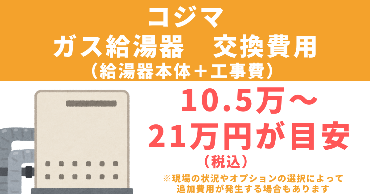 コジマでガス給湯器を交換する場合にかかる費用は10.5万〜21万円が目安です。お得な価格で販売されていますが、商品によっては他社の方が安い場合もあります。