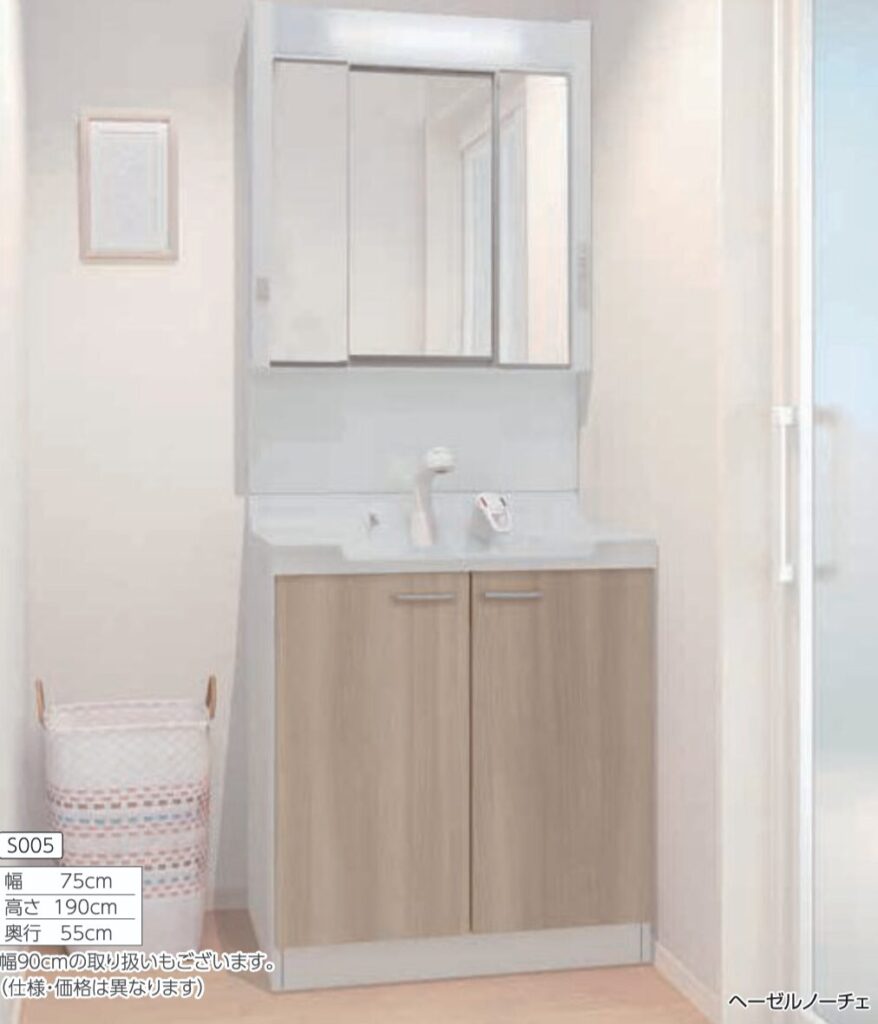 最大の魅力は、工事費込みで8万円台〜(幅75cmの場合)という高いコストパフォーマンス。機能面では、LED三面鏡、くもり止めヒーター、陶器ボウル、シャワー水栓など、基本的な機能はしっかり搭載。価格を最優先し、標準的な洗面台への交換を希望する方に最適な、ヤマダ電機のリフォーム普及価格帯商品です。