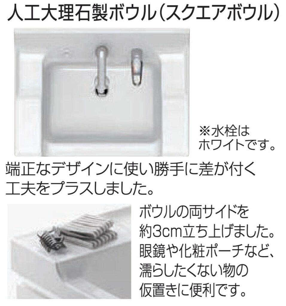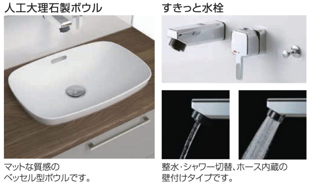 「バンブー」は、シャープな印象のスクエアボウルを採用し、洗練された洗面室を演出します。普及モデルの「プルーニャ」より価格は上がりますが(工事費込みで109,780円〜)、モダンでスッキリとしたデザインを求める方に適しています。機能と見た目の両方にこだわりたい人向けの、コストパフォーマンスに優れたデザインモデルです。