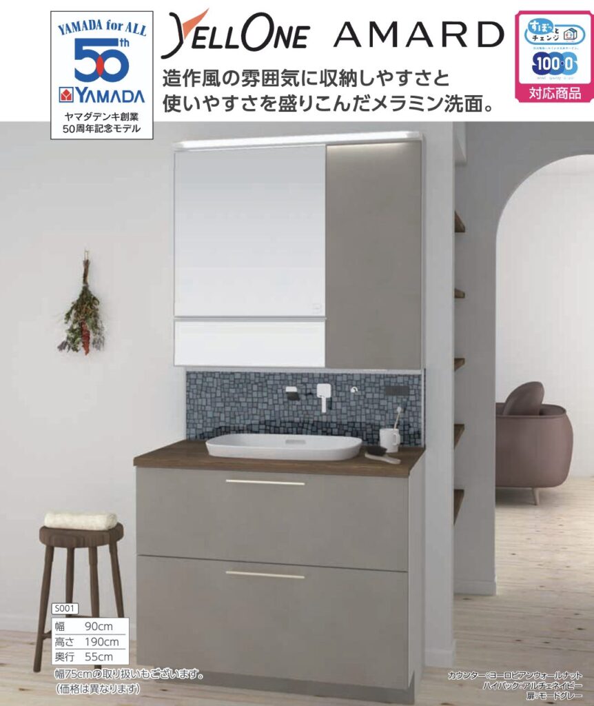ヤマダ電機のオリジナル洗面台「YELL ONE」のAMARD(アマルド)は、造作風のメラミン化粧台で、高いデザイン性が魅力です。